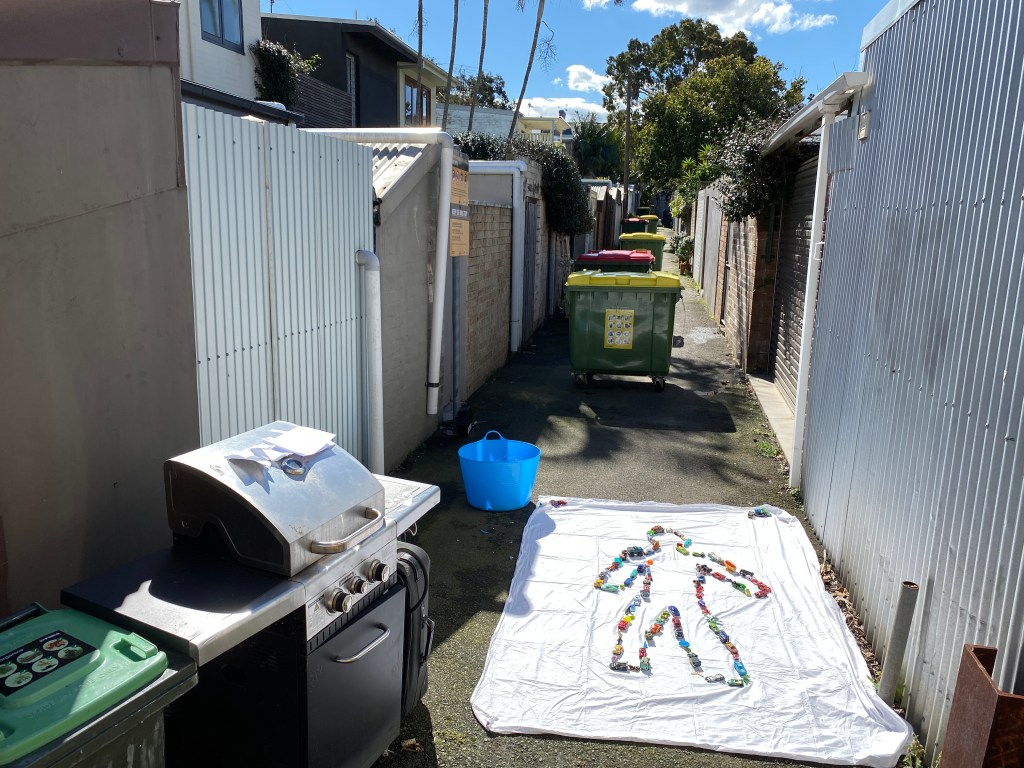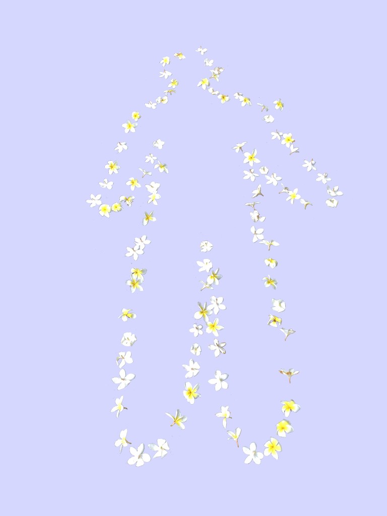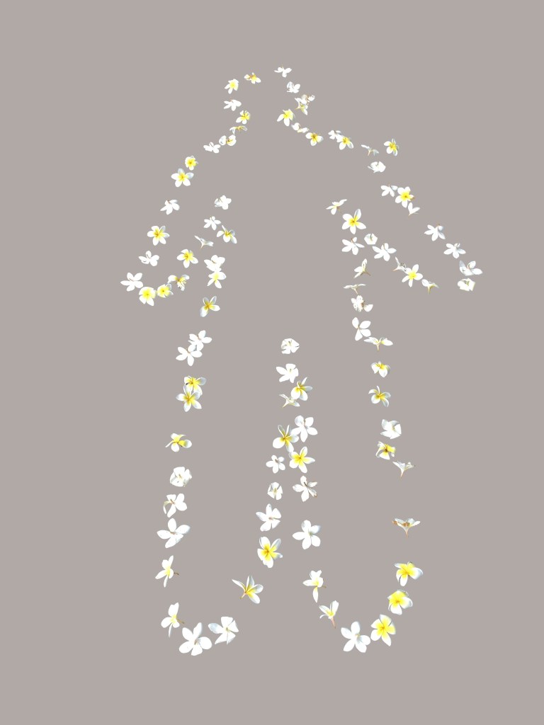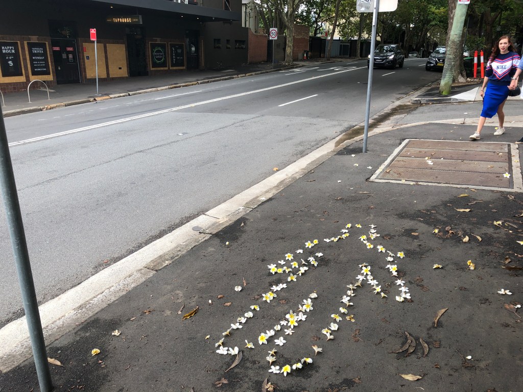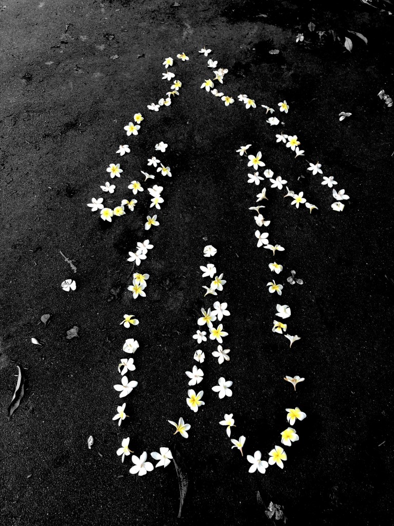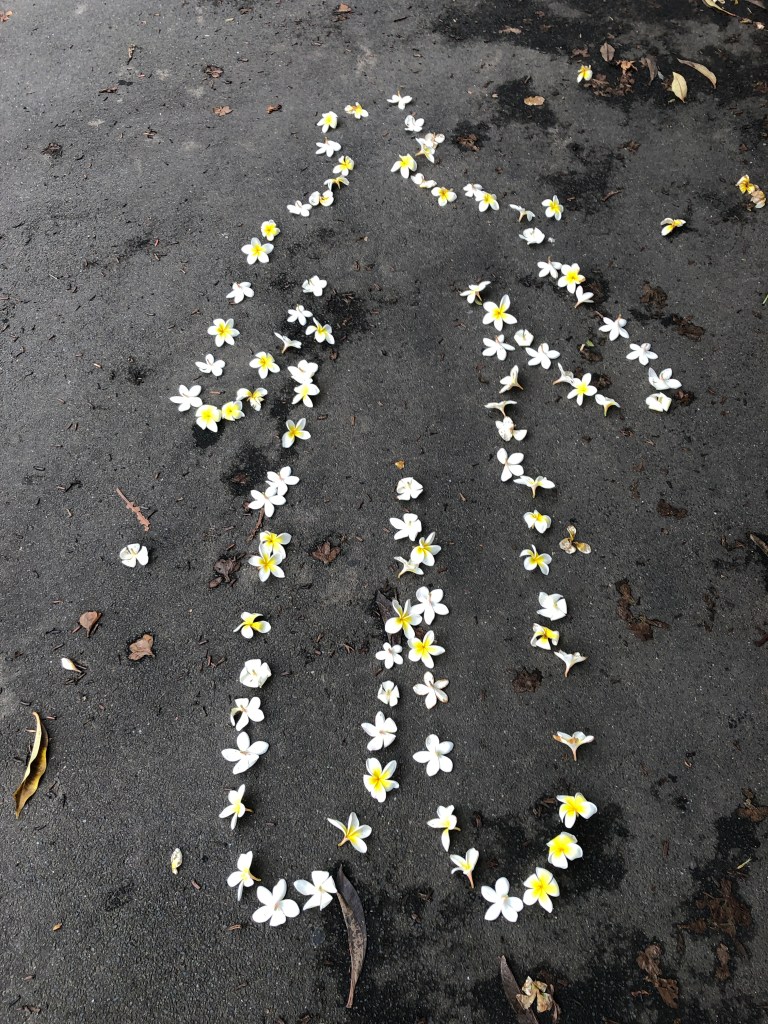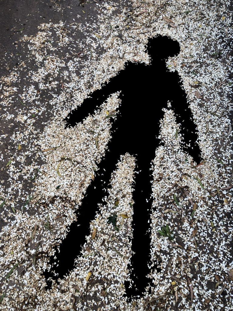 Meanwhile, I became aware of my everyday surroundings in a new way. Something as mundane as flower petals in the laneway suddenly became materials on a surface for mark-making (and the scent was heavenly). I played around with the documentary photo later, turning the figure into The Void.