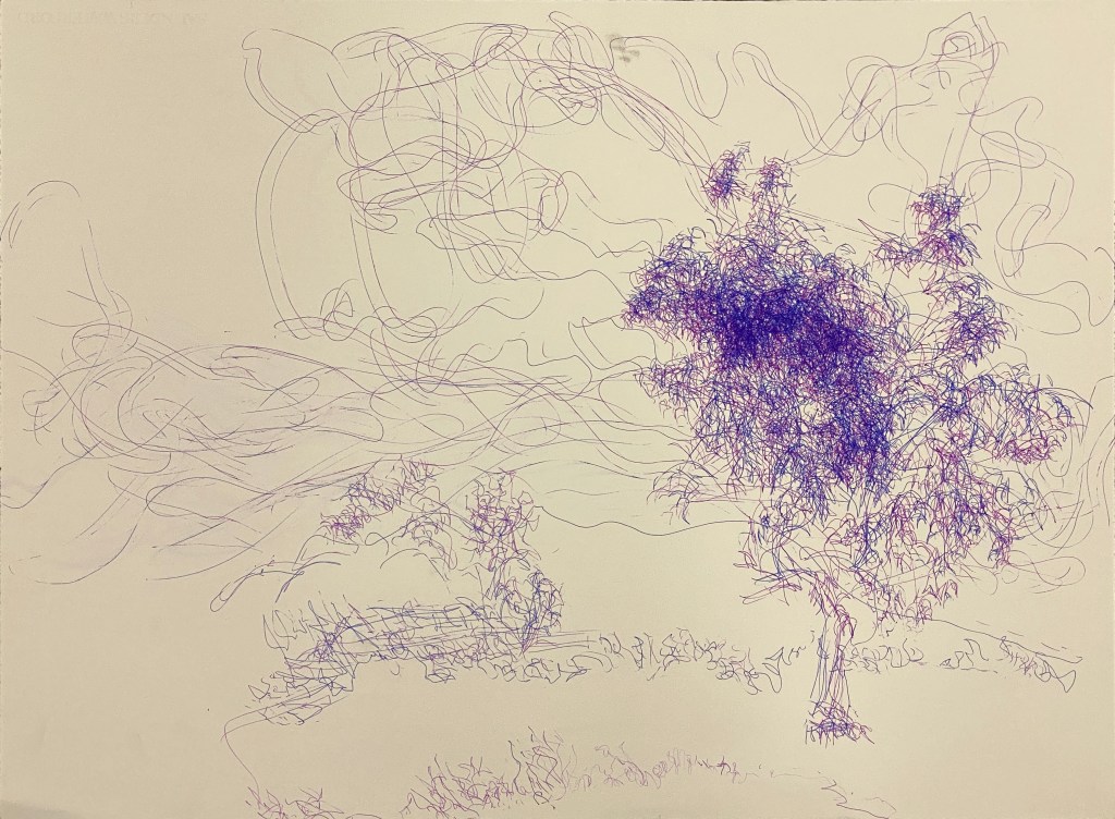 While reflecting on the day’s work, I realised that I was drawing literally everything I could see inside my chosen frame; the same way a camera records everything in the viewfinder. There was no sense of importance, no prioritised subject matter, no dimensionality. There is some negative space but only because it happens to be a patch of sky. In my next drawings, I decided to draw just one tree so I could address these ideas.