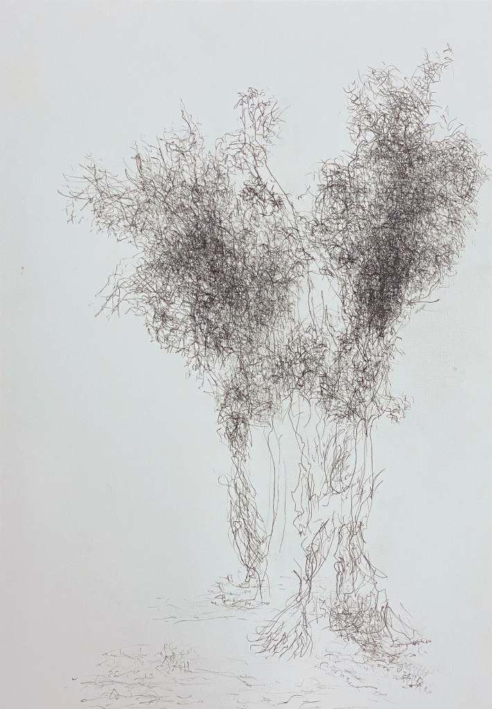 This blending of methods – not looking at the paper, continuous line, multiple pens, and minimum drawing time –prevents that anxiety as it is impossible to draw photo-realistically. I also discovered an added intervention: quick drawing and keeping nibs on the surface means my hand continuously slides over wet ink, smudging the image.