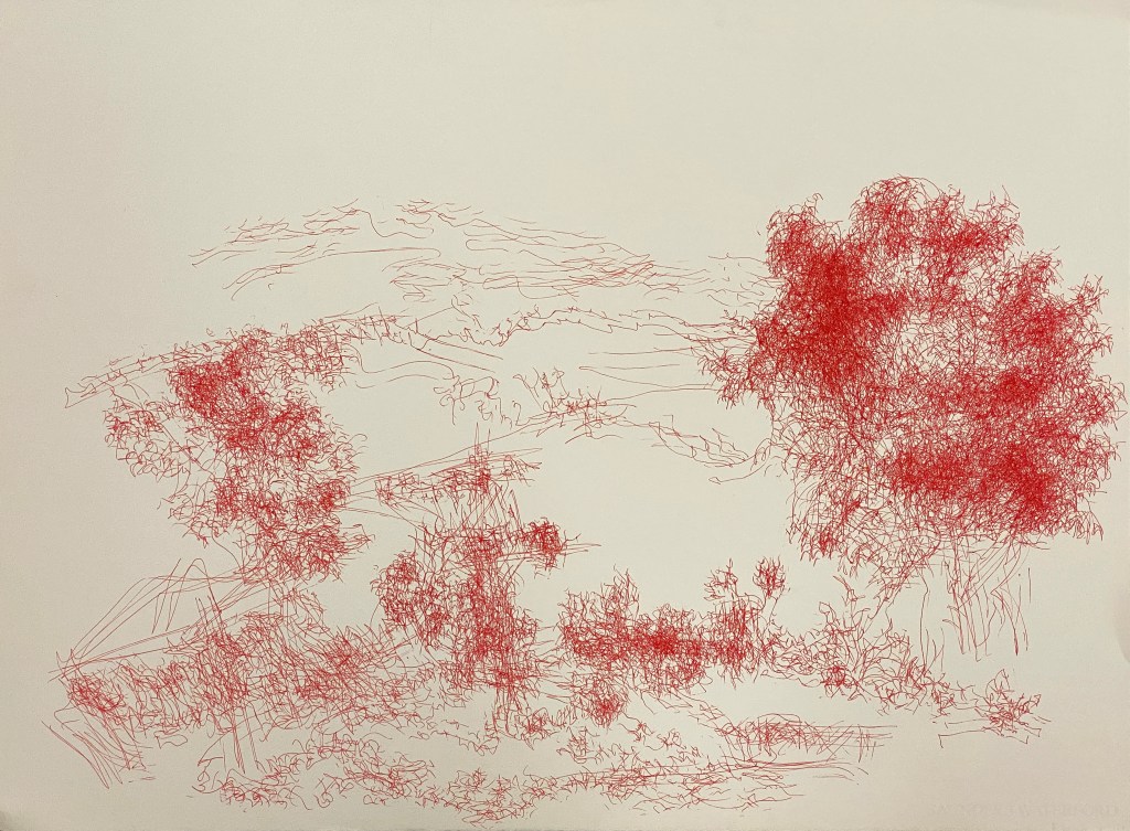 Then, to make sure I hadn’t just become good at drawing Fowlers Gap, I began drawing offsite on the way back to Sydney, stopping at Menindee Lakes and the Living Desert and Sculptures outside Broken Hill, where I drew mulga trees in the approaching sunset.