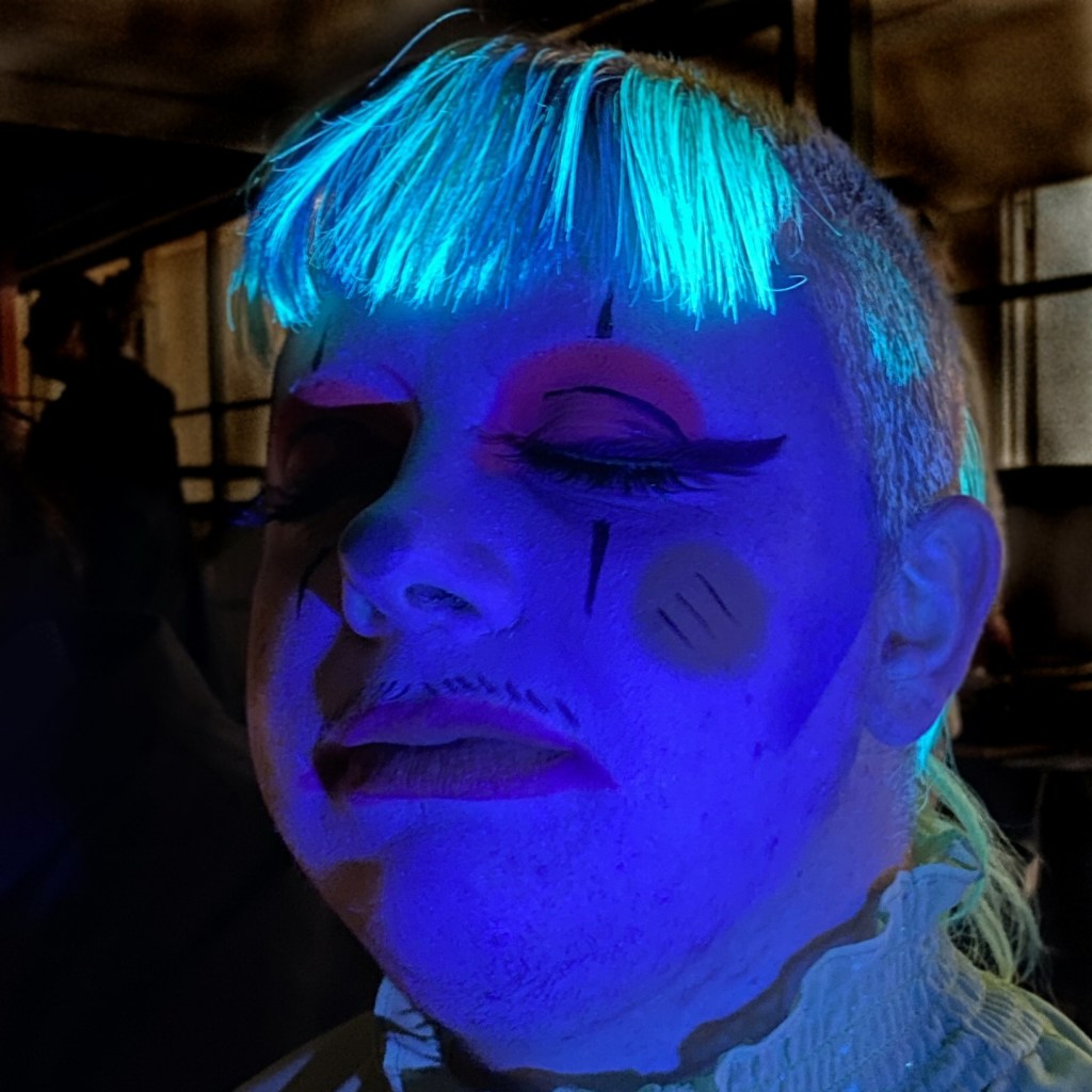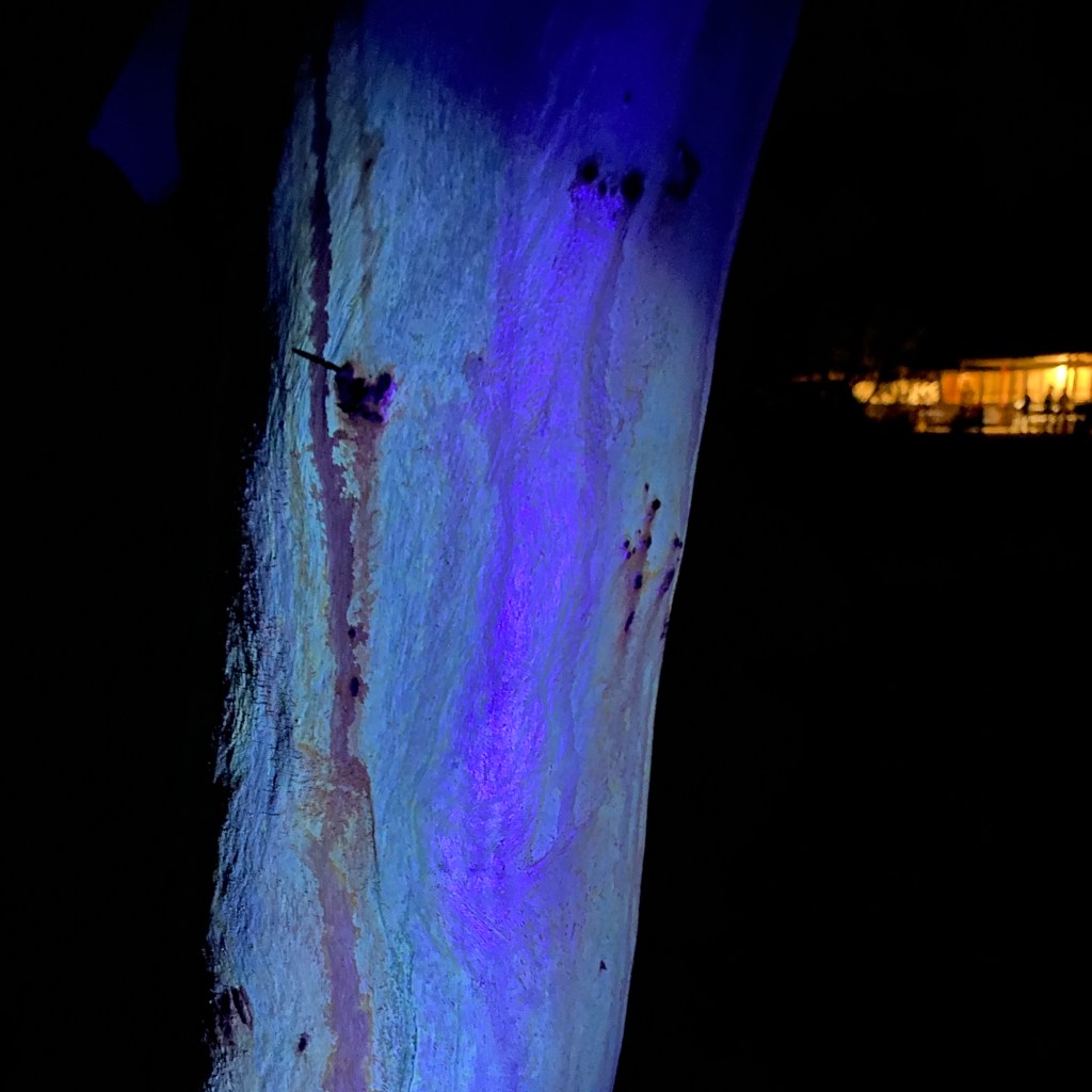 Ultraviolet light became a photographic interest for me when my flatmate bought a UV torch to look for scorpions (Kloock, Kubli, & Reynolds, 2010) but we spent more time looking at everything else. I brought torches to Fowlers Gap with the thought that they might produce some interesting results. I learned that organic and mineral objects fluoresce to varying degrees but the artificial ones react most strongly as they include fluorescent compounds (U.S Food & Drug Administration, 2019) to make them appear brighter. Chlorophyll in a eucalyptus trunk glows softly (Johnstone, Tausz, Moore, & Nicolas, 2012) but Blake’s clown make-up and dyed hair are extremely reactive.