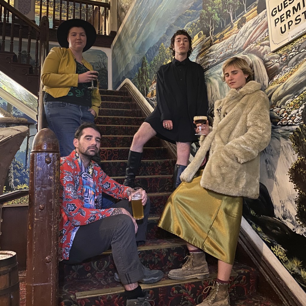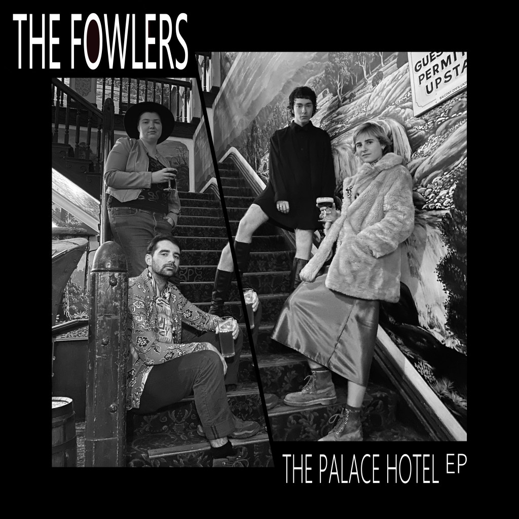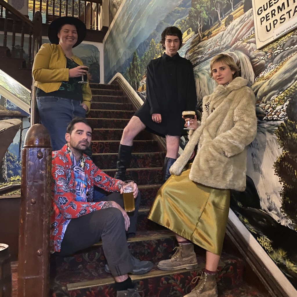 Fake album covers have has been an interest of mine for several years but this is my first deliberate attempt to create one from scratch, inspired by the preponderance of op-shop chic on our last night at the Palace Hotel. My pattern recognition subroutine put Casper, Elijah, Lucy, and Toby together in a 1980s New Romantic band with a punk sensibility (clockwise from top left: drummer, keyboardist, bass and backing vocals, lead guitar and vocals). I managed to get two shots without realising that neither was useable… which lead me to cut them down the middle and paste the good halves together. Mistakes can lead to interesting solutions.