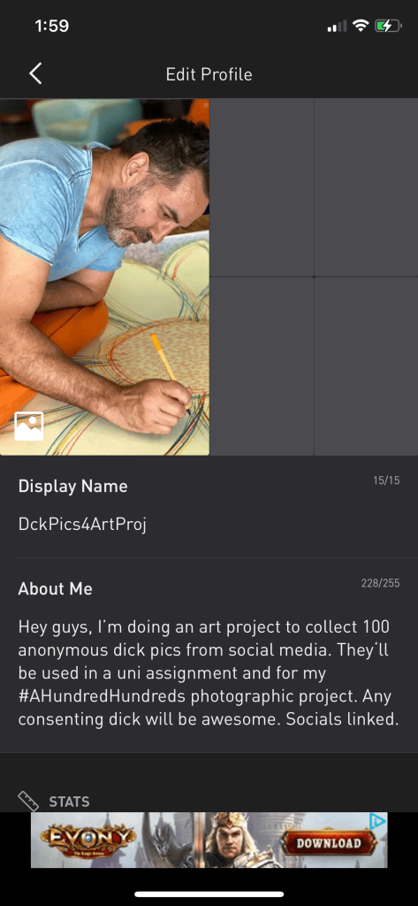 - choosing Grindr as a social media service that is known for “positive reactions to (even) unsolicited dick pics” where I could create a profile without misrepresenting myself as a woman or potential sex partner