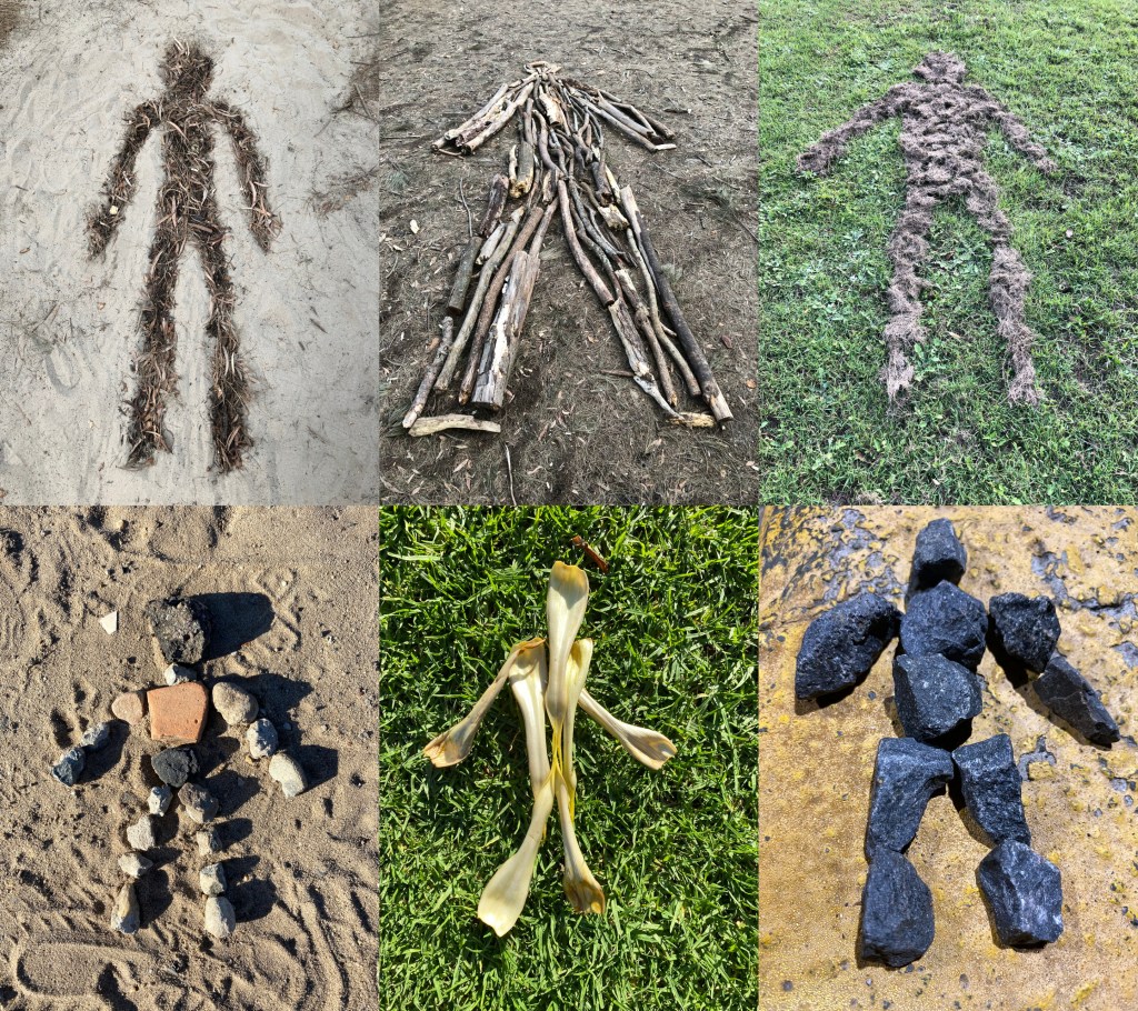 Carving out negative spaces is not the only technique available to the sculptor of nature; there is also the construction of positive spaces. Pine needles, sticks, mown grass, stones, bits of a fig tree, and gravel are some of the materials I have used (see above). I try to walk as lightly as I can through the environment so I try to only use things that have fallen naturally, close to where they land.