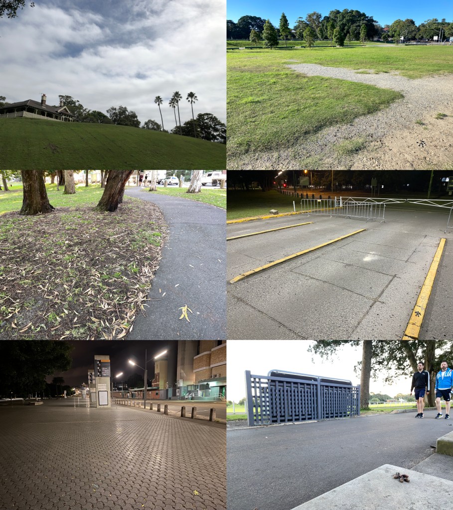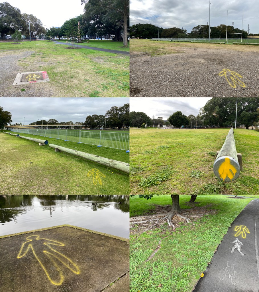 As I had feared, someone saw me spraying paint all over the park. Although he was apologetic for being confrontational (this is the Eastern Suburbs after all) he challenged me regarding my aberrant behaviour. Fortunately I had prepared two responses. Firstly, I said that this was an “art project” and he took a figurative step back (this is the Eastern Suburbs after all). Secondly, I said I was using spray chalk “like they use on the footpath” that would disappear with weathering. Fortunately it was the same thing that his toddler uses on their footpath (this is the Eastern Suburbs after all) so it was all good. The crisis was averted but the anxiety remains. I imagine this will be an ongoing feature in my work as I explore the space where artistic expression meets social expectation.